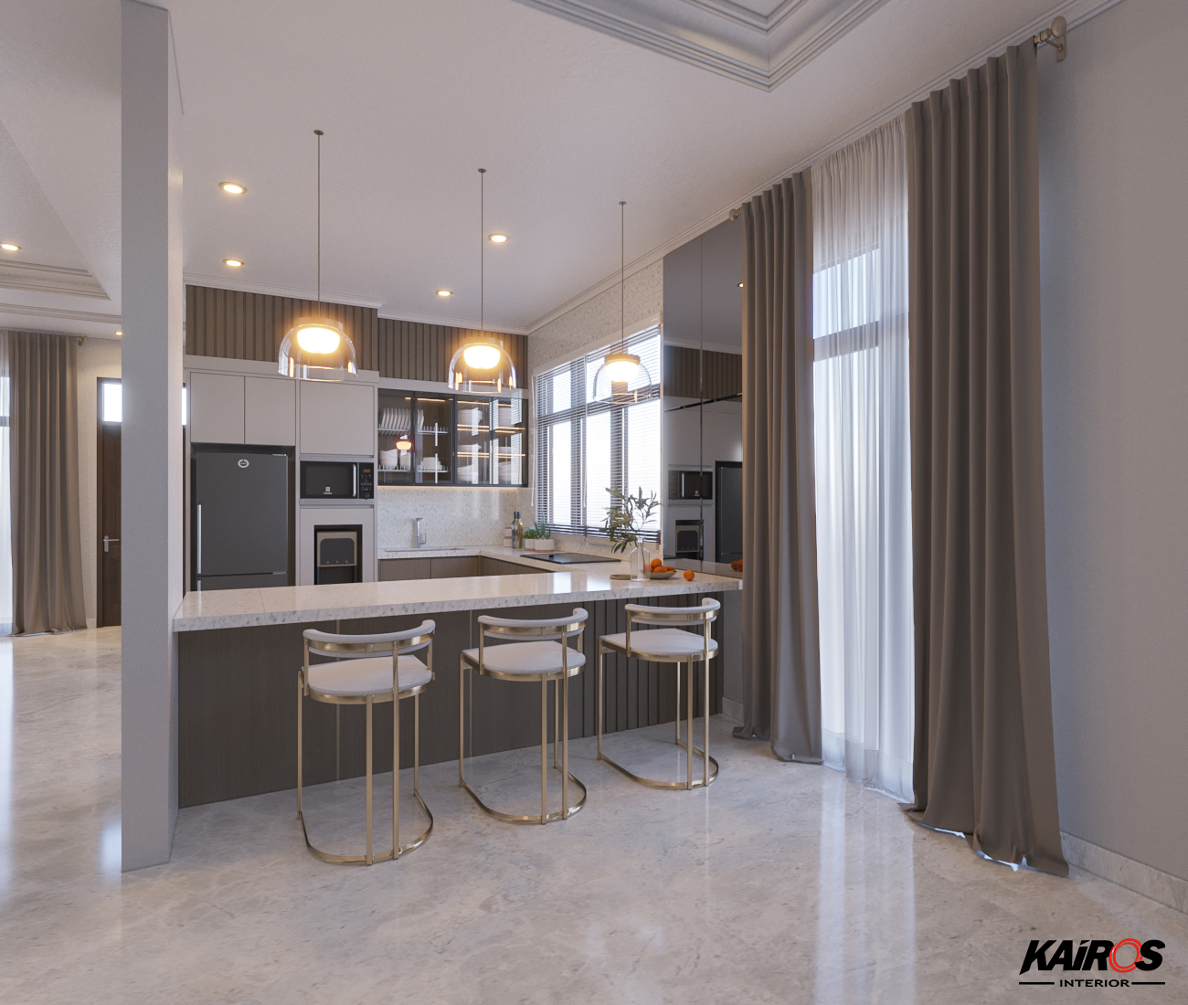 Warna Monokrom dapat memberikan tampilan ruangan yang trendi dan berenergi. Anda bisa mengkombinasikan marmer, epoxy pada backsplash pantry atau island.